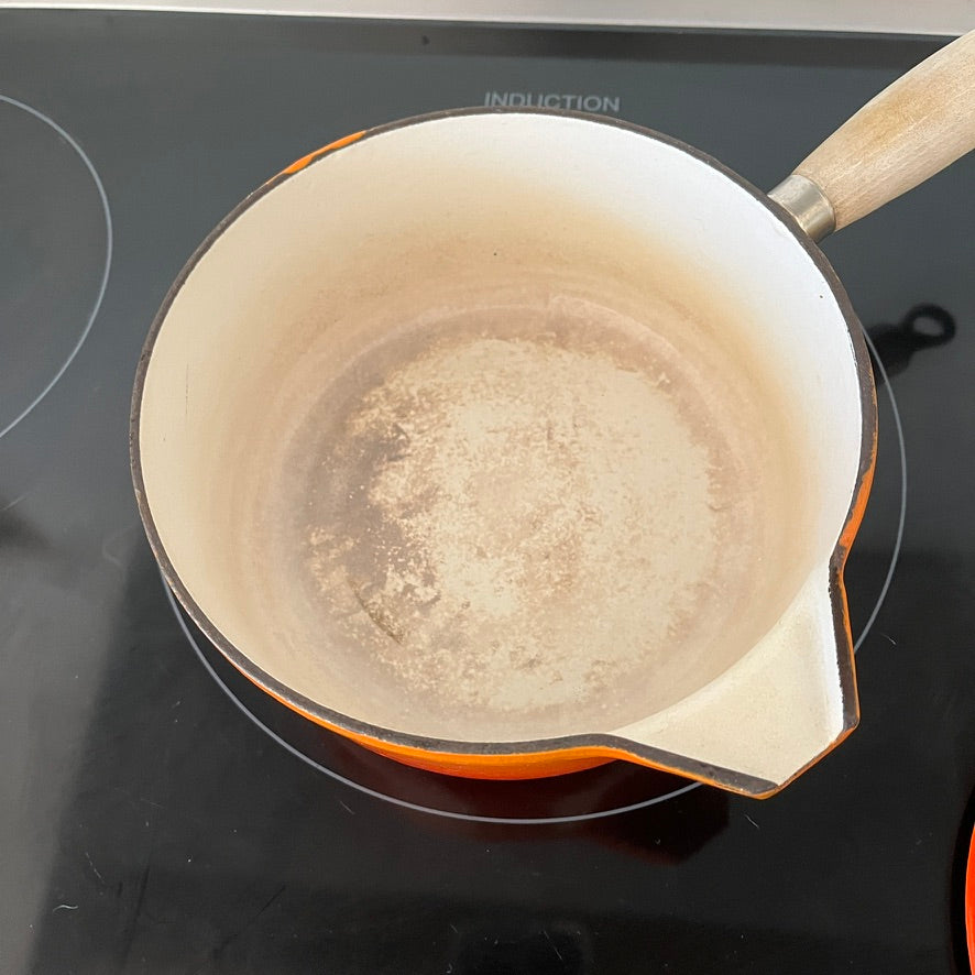 Vintage Cousances (is Le Creuset) gietijzeren steelpan met deksel (heeft wat schilfertjes). De pan heeft een diameter van 18 cm en is gebruikt, met aanslag op de bodem. Ideaal voor het verwarmen van melk, sauzen en andere kleine hoeveelheden.