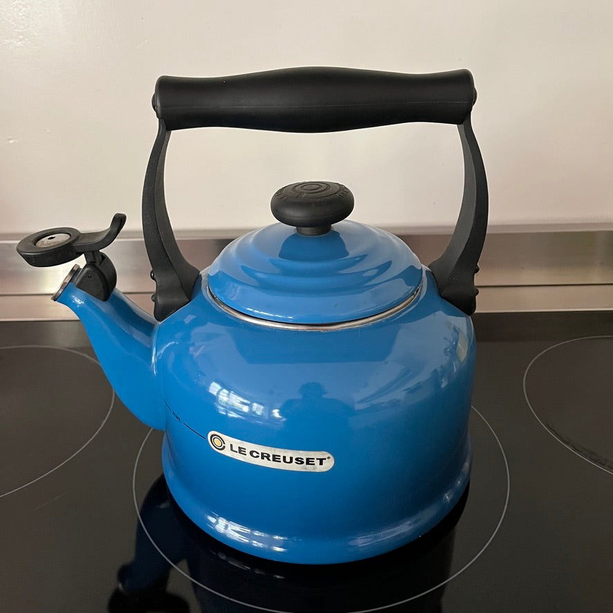 Le Creuset fluitketel met een diepblauwe kleur. Deze grote ketel (inhoud 2.1 liter) heeft extra sterke bodem die ook geschikt is voor inductie. Hij zorgt ervoor dat het water snel opwarmt. De ketel heeft een ergonomische en hittebestendige handgreep. Hij is gemaakt van geëmailleerd staal en verkeert in zeer goede staat.